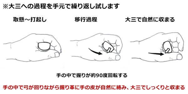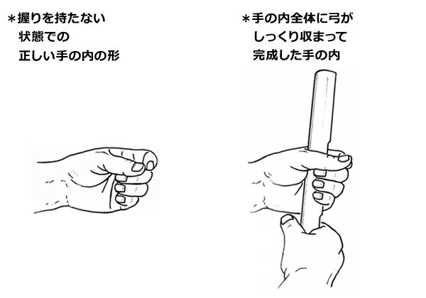 弓を持たない状態で正しい手の内の形をつくり、そこにしっくり収まる握りを9種類(外形寸法表参照)の中から探します。そこに手の内の収まり具合や微妙な感触の差をさらに折り込むことで、真に自分の手に最適な寸法を探し出すことができます。正しい手の内の形については、指導をうけている先生に教えていただいてください。