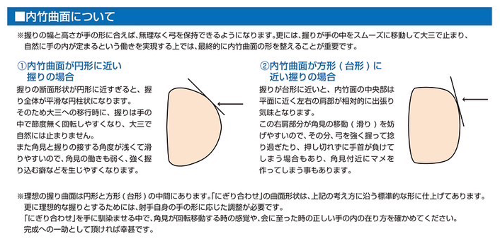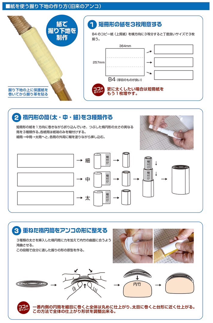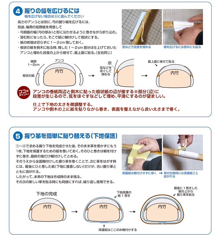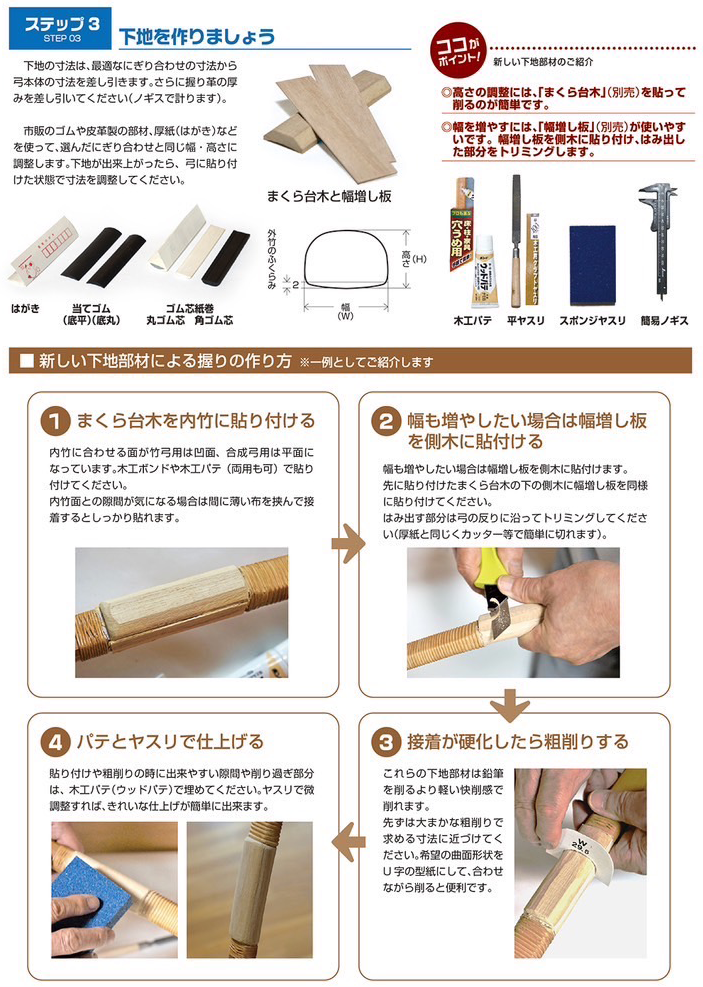 伝統的な方法としては厚紙や皮などの重ね貼りや、葉書用紙などを三日月状に巻き重ねて曲面に整える方法、等があります。 高さと内竹面の調整用にはゴムや皮革製の部材が市販されています。 これからは、幅の調整も含めて新しい調整部材(幅増し板・まくら台木)もありますので、是非とも自分自身の手で調整した、真に最適な握りをつくり上げてください。