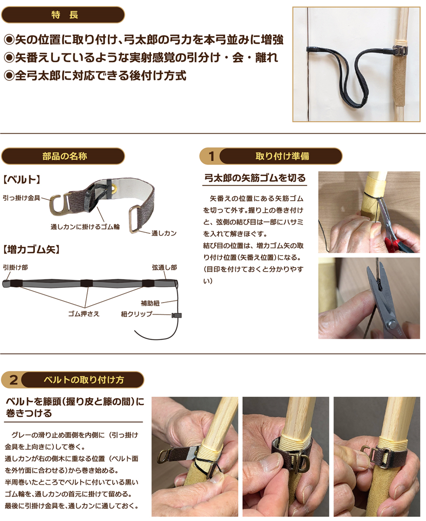 - 純正専用弦(弓太郎の型式に応じた専用弦)以外は使わないでください。弓本体との張力バランスが損なわれて良い結果は得られません。